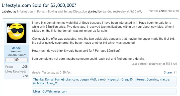 据域名论坛namepros.com上一篇帖子称,域名LifeStyle.com此前曾有一段时间以300万美元的价格出售,但近两日有网友收到这枚域名有新出价的通知,之后点击出售链接却发现已经下架,或许已经成功交易。