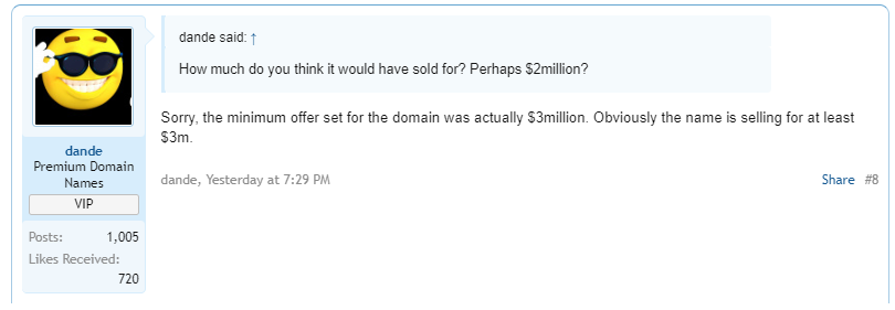 而在namepros.com论坛上也有不少网友纷纷说出了自己的观点,有人觉得这枚域名的价格应该在50万-150万美元之间;也有人觉得这枚域名的价值不低于200万美元;而爆料这个消息的当事人则表示,这枚域名最低报价为300万美元,显然成交价不应该比这低。